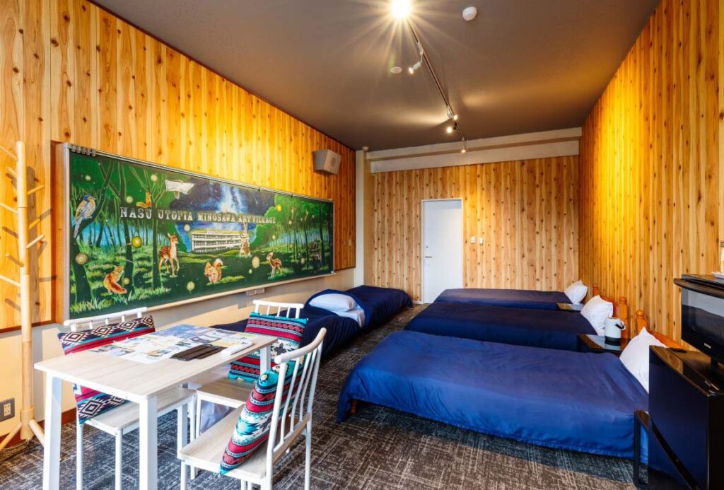 那須ユートピアは、廃校となった小学校をリノベーションした体験型宿泊施設で、2026年2月に全室サウナ付きの宿としてリニューアルしました。